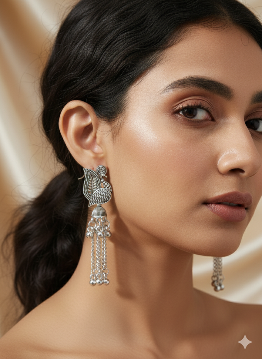 These Oxidized Peacock Tassels earrings showcase intricate peacock motifs at the studs, with a dome-shaped jhumka element beneath. Multiple fine chains hang as tassels, each tipped with a tiny metallic bead, creating elegant movement and subtle charm. The oxidized finish imparts an antique, bohemian character, making them a refined choice for complementing traditional Indian attire or adding a distinctive edge to contemporary fusion outfits.